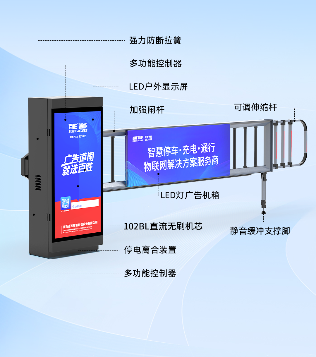 | 廣告道閘 | 機箱廣告位:980×495mm | 比競品(pǐn)可視麵積大15% |